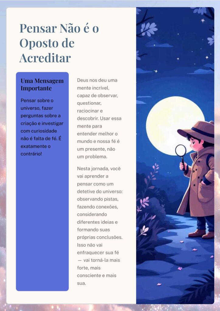 A série digital criada por apologistas, teólogos e psicólogos infantis para ensinar crianças de 8 a 14 anos a PENSAR a fé — não apenas repetir histórias bíblicas.